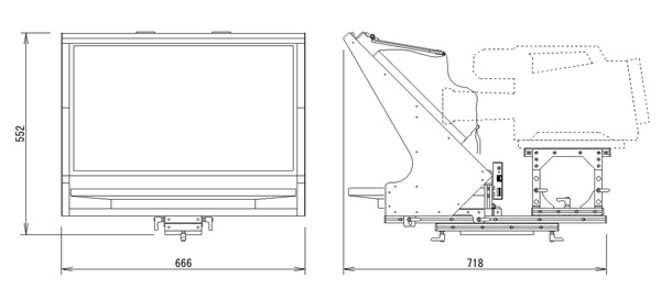 27型プロンプターに大型ENGカメラを搭載することができます。 全体を前後にスライドできますので、カメラ搭載後に重量バランスの調整が簡単に行えます。また、カメラ自体もスライドできますので、レンズとハーフミラー間の微調整も可能です。